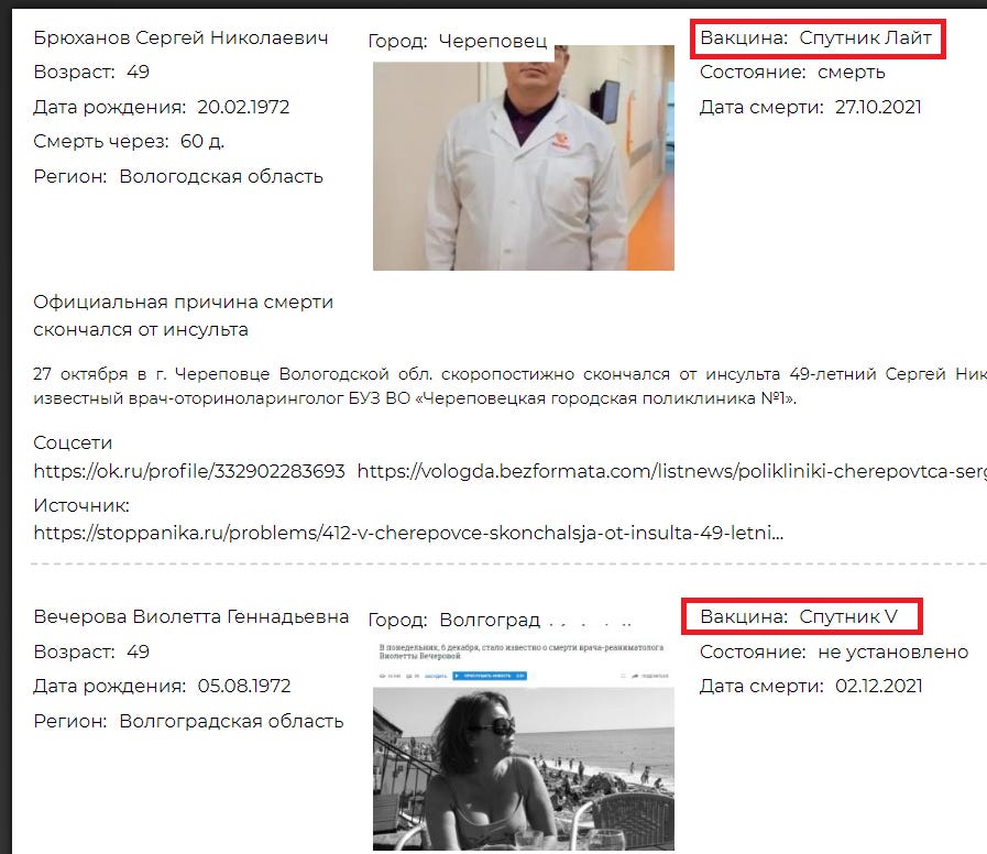 Since September 2021, an average of at least a dozen new reports of citizens dying shortly after vaccination began to appear on the Internet every day. Social activists, independent researchers began to collect their own databases. Today, the “League of Patient Defenders”, “Parents of Moscow”, “Stopvaccism”, the Victims of Vaccinalism telegram channel, and individual bloggers are doing this.