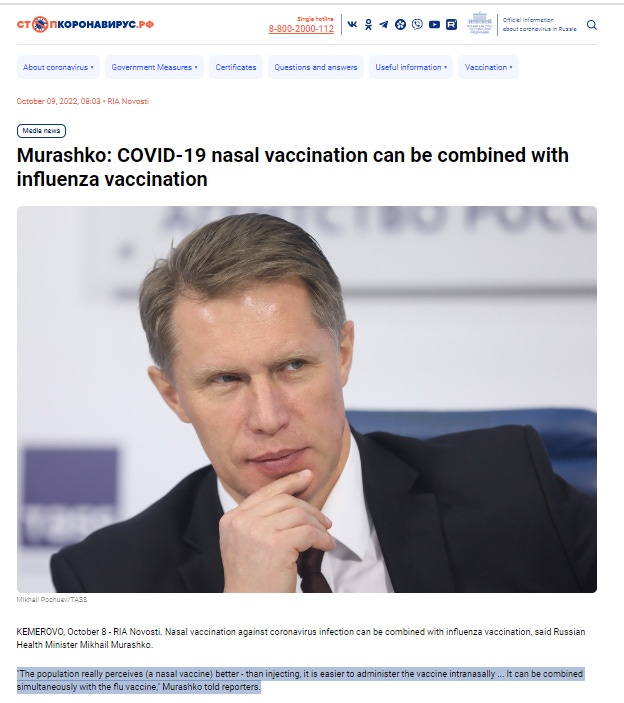 “The population really perceives (a nasal vaccine) better than injecting [the vaccine], it is easier to administer the vaccine intranasally ... It can be combined simultaneously with the flu vaccine,” Murashko told reporters.