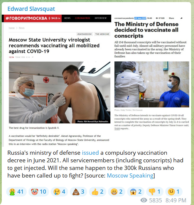 On September 23, we posted a message on Telegram that referenced the Russian MOD’s compulsory vaccination policy (which is real, and was enforced). We asked whether this policy would also apply to mobilized Russians: