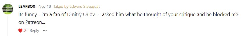 Dmitry Orlov is a good candidate because he’s very successful and well-known (so we can’t be accused of punching down), and also he blocks anyone who criticizes him—making him immune to criticism.