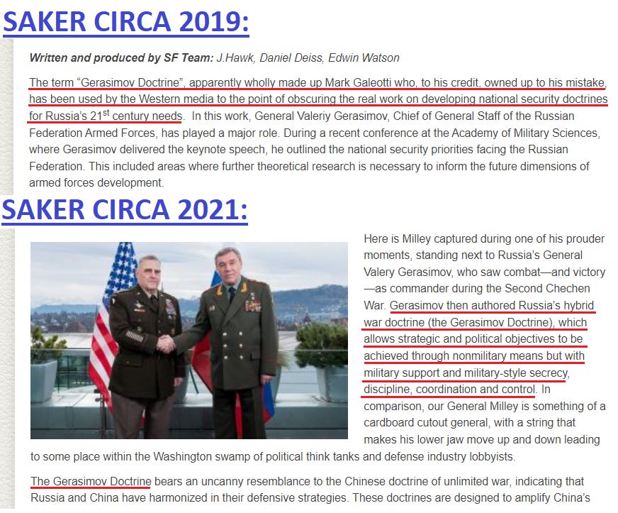 There is no Gerasimov Doctrine. The guy who coined the term even admitted that it doesn’t exist. It’s a 100% fake NATO meme. Tellingly, the Saker (via SouthFront)—where Orlov’s masterpiece was republished—reported in April 2019 that the Gerasimov Doctrine was “wholly made up” and used by Western media to “obscure” the “real work” being done to ensure Russia’s national security.