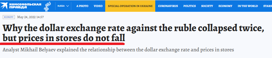 “It is important to understand what is happening with the dollar in Russia,” notes Sergey Khestanov [, some kind of Russian economics nerd]. “The way we used to interpret [the valuation of the ruble in USD terms] is not entirely effective now. Since the end of February, the Central Bank of the Russian Federation has significantly changed the regulation of the circulation of foreign currencies in Russia. In fact, the free conversion of the ruble into foreign currencies has been partially abolished. A lot of complex currency restrictions have been introduced. The consequence of this was a strong change in the country’s foreign exchange market.” […]