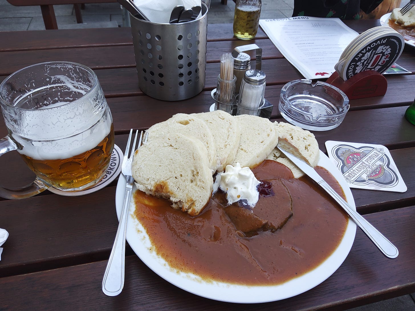 The reason this blog post is late is because I wasn’t staring at a screen yesterday—I was in a dainty Czech town, eating svíčková and drinking charming Czech beverages.