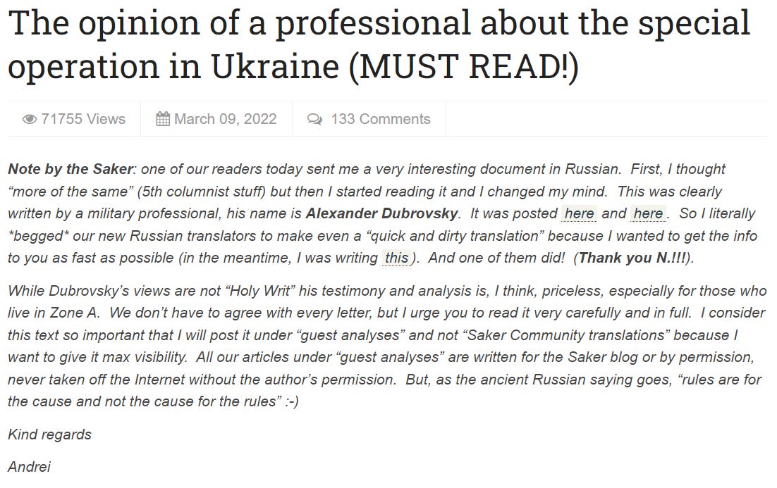 Fascinating. Because in March 2022, the Saker published an article by a “Russian military professional” who stressed that time was of the essence in Ukraine.