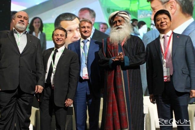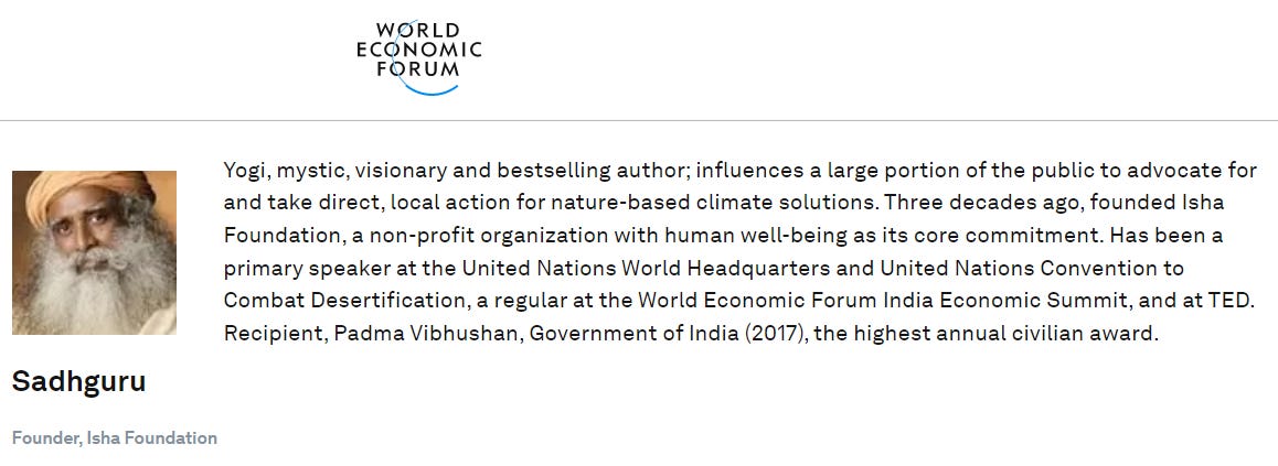 But why is this celebrated mystic shilling clot-shots and hanging out with the Schwab-worshipping CEO of Russia’s creepiest bank? Nobody knows. But here is Sadhguru’s bio on the World Economic Forum’s website, for those who might be interested: