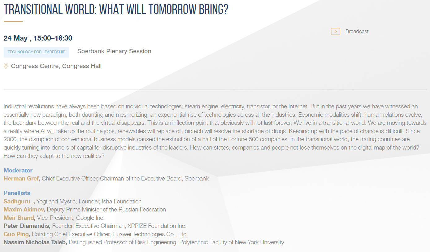 We’ve time-traveled back to 2018; Herman Gref is moderating a panel discussion at the annual St. Petersburg International Economic Forum called “Transitional World: What Will Tomorrow Bring?”