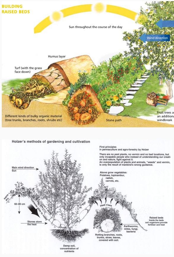Hügelkultur (diagram shown above) roughly translated into “hill culture”: this method consists of creating raised garden beds by covering rotting wood with compost and soil, and then planting into them. If you think about it, it’s really just re-creating the effects of forest floor decomposition—but helping accelerate it in one’s own garden space. I like to use variations of this (such as an ‘inverted Hügelkultur’ or ‘dead wood swale’ for building deep and fertile soils beneath new raised beds I am building).
