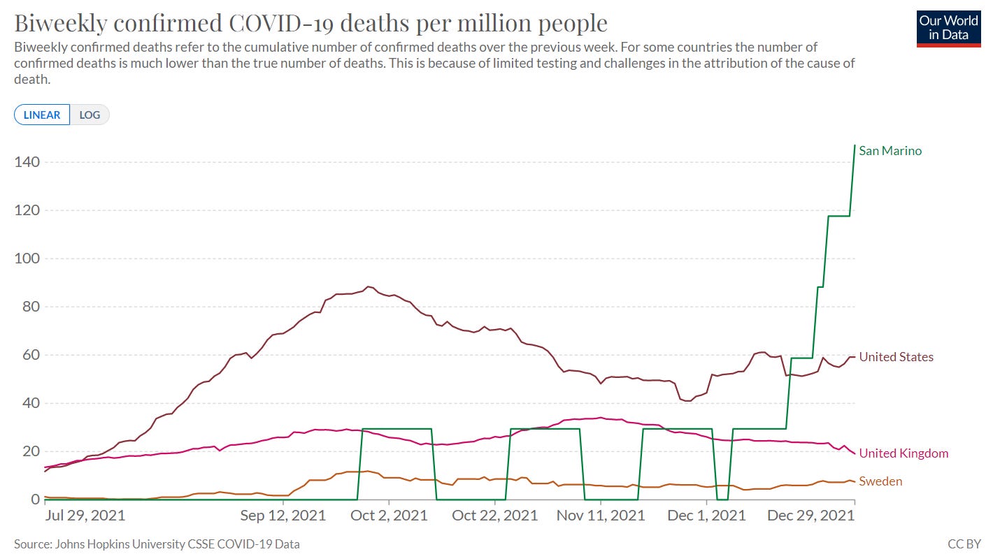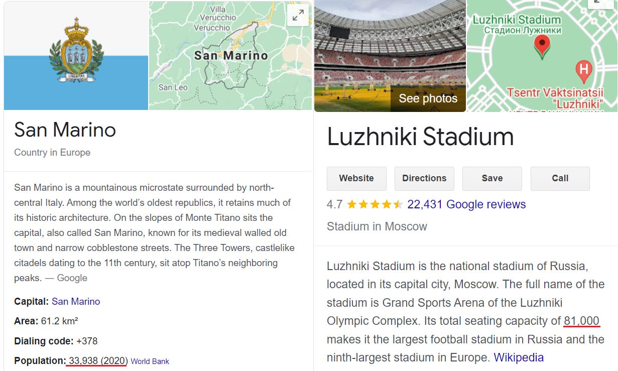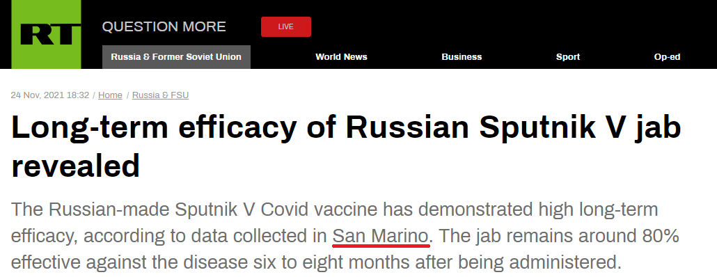 It’s genuinely pathetic that RT peddles dubious Sputnik V “studies” from San Marino, a country whose total population is less than half the capacity of Moscow’s Luzhniki Stadium. (To RT’s credit, the article mentions almost nobody lives in San Marino, so…why did they write about it? Seems a bit “local,” no?)