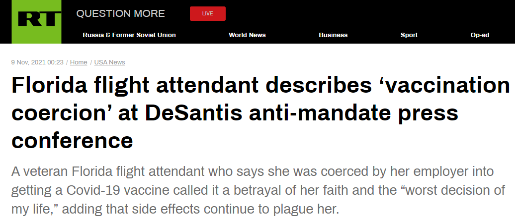 Here is RT in November weeping for an American lady who was bullied into getting a COVID shot: