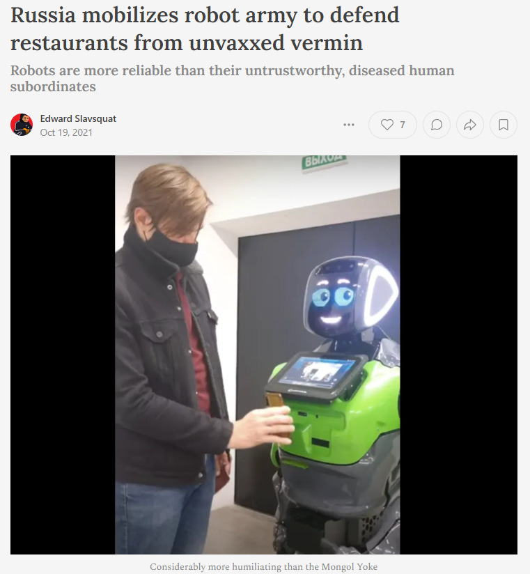 It was exactly 365 days ago when your humble correspondent, nestled in his Moscow suburb, typed his first-ever Substack Exclusive, titled: “Russia mobilizes robot army to defend restaurants from unvaxxed vermin.”