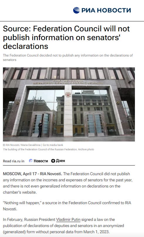 Deputy Speaker of the Federation Council, Yuri Vorobyov, reassured the public that all 175 senators had dutifully submitted their incomes for 2022, but this information “would not be published in the open press due to known circumstances.”