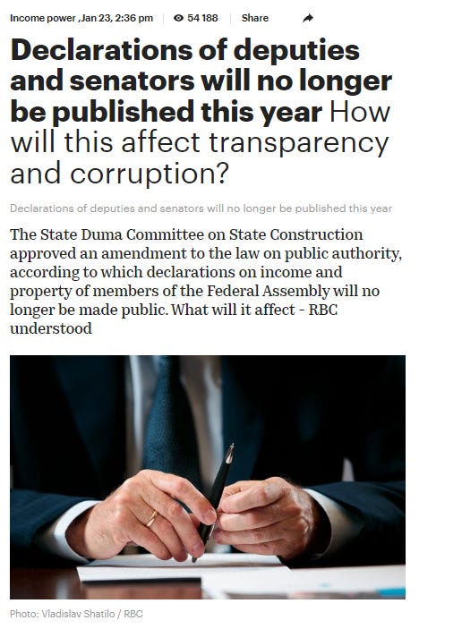 Riley is such a shill. As someone who has lived in Russia for a few years I can unequivocally confirm that if you ask a normal Russian what they want from the government it's that Federal Officials not be harassed about shady income. I even saw a video posted by Russian troops at the front directly on prospect druzhba in Marinka and the guys were threatening to mutiny if the Politicans were required to be open about how they were able to afford their new yachts and villas in Geneva this year.