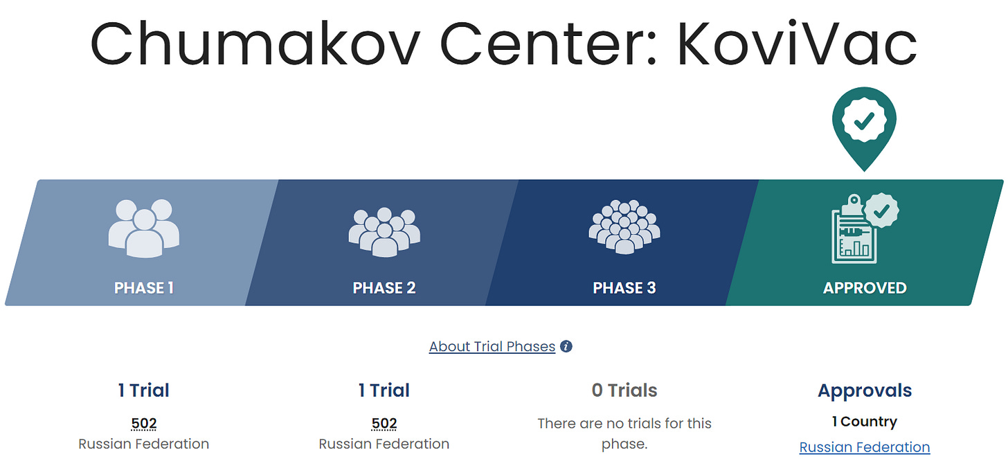 It’s a proven fact that Sputnik V is 250,000% effective and also cures Ebola, but you don’t hear very much about KoviVac. This “classic vaccine” was approved after being tested on 600 people as part of a Phase I/II trial. There was no need for unnecessary and archaic Phase III testing: