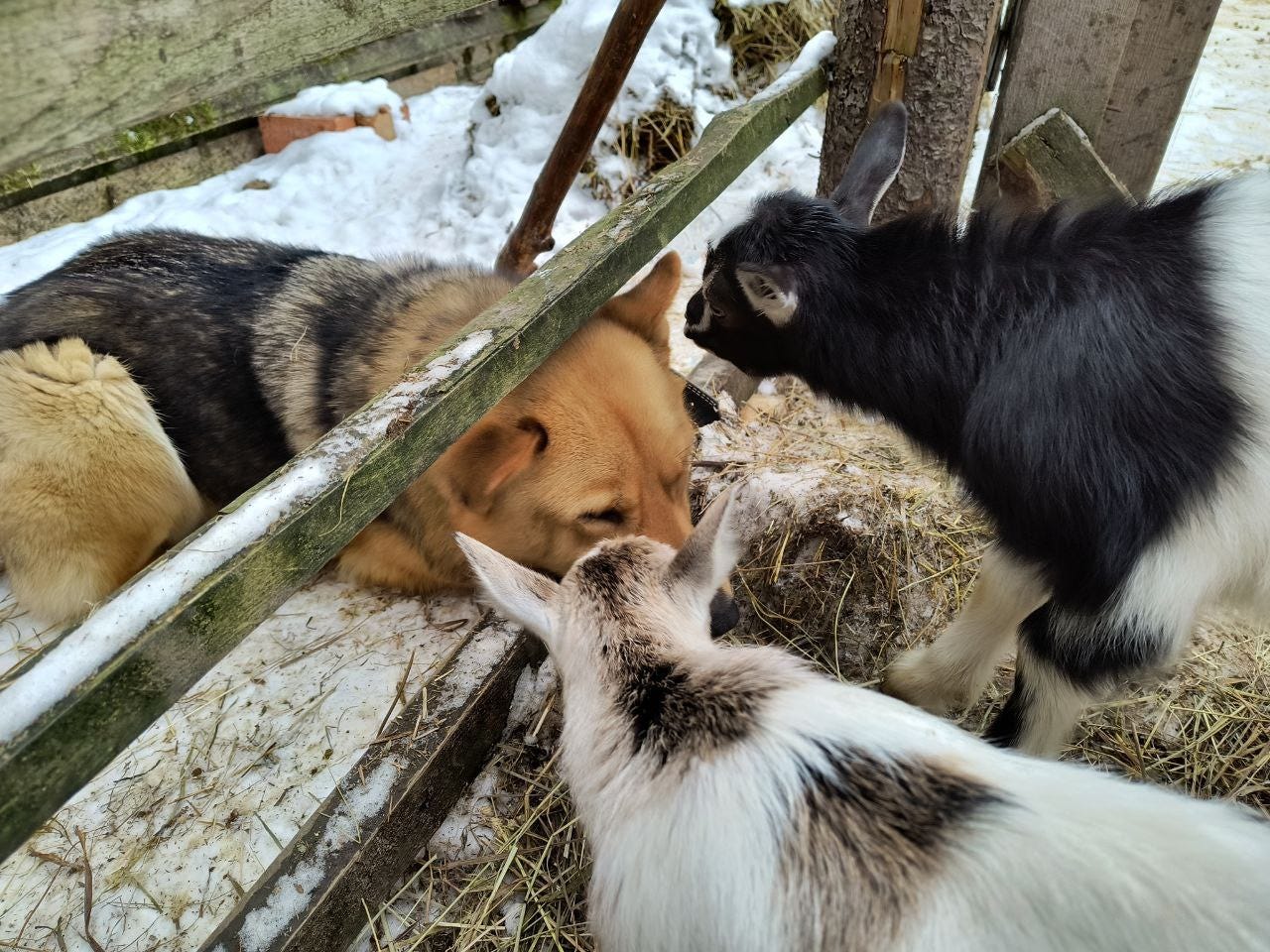 The goats are also very fond of Potato the Dog.
