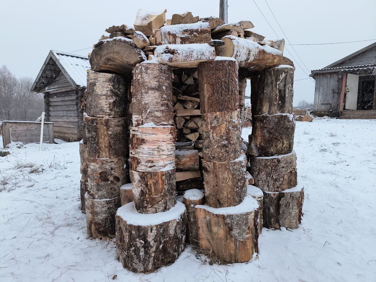 The logs that I was too lazy to split were used to construct a woodpile rotunda.