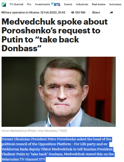 By the way: According to oligarch Viktor Medvedchuk (a close friend of the Russian president; Putin is godfather to Medvedchuk’s daughter), former Ukrainian president Petro Poroshenko begged Putin to “take” Donbass—but Putin refused, insisting that the breakaway republics belonged to Ukraine.
