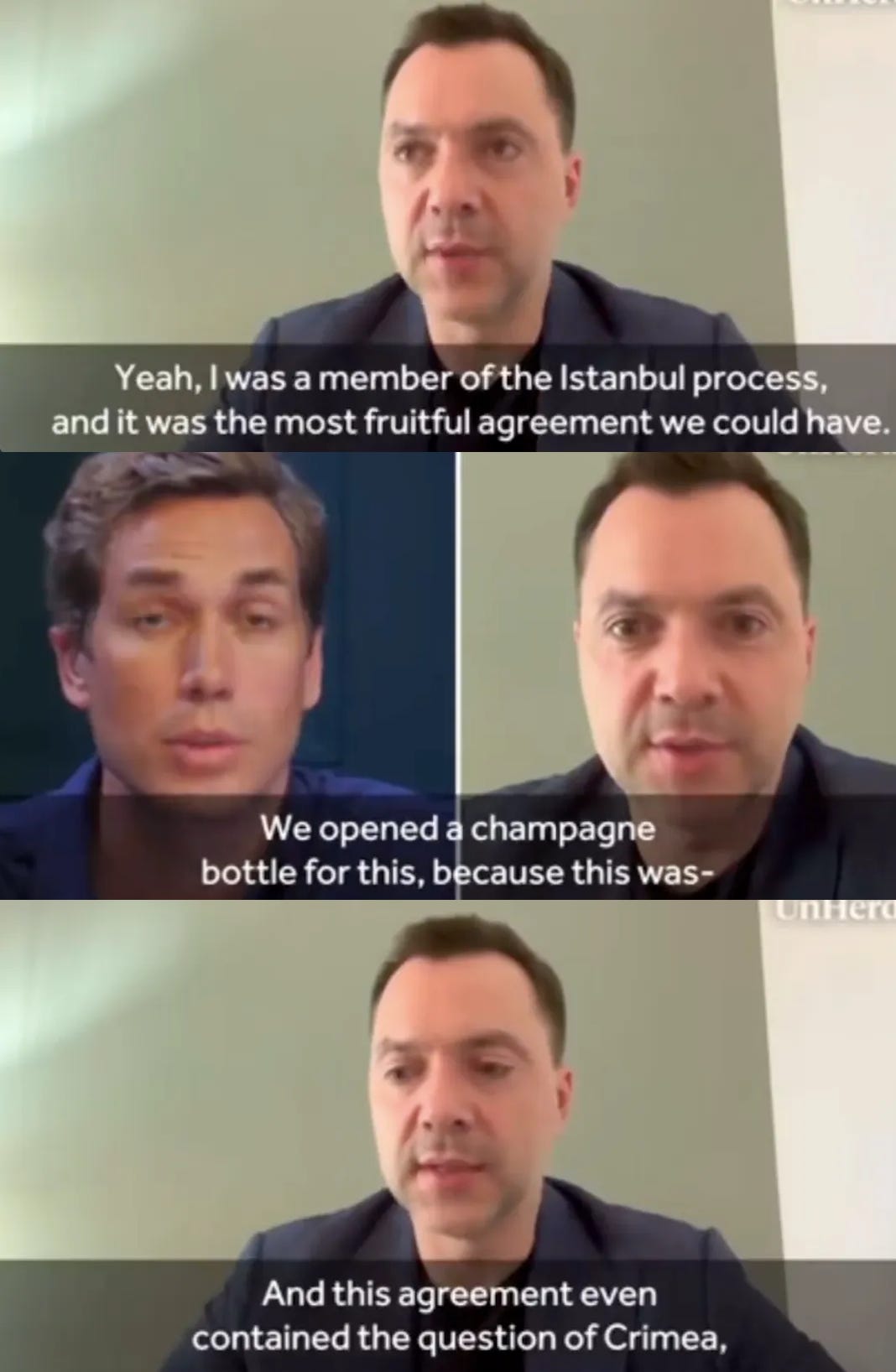 Arestovych: I was a member of the Istanbul process, and it was the most profitable agreement we could have done. They concluded there two previous agreements that were extremely dangerous for Ukraine: Minsk one and Minsk two. This agreement even contained the question of Crimea. It took 10 years of discussion, 15 years of discussion on the status of Crimea, and it meant security for the Black Sea. But now — I don’t know. Because mid-agreement in Istanbul we came to Kiev and after Bucha we heard from the President that we had stopped the negotiations. The next meeting was to be on the ninth of April and on the second of April it was declined.