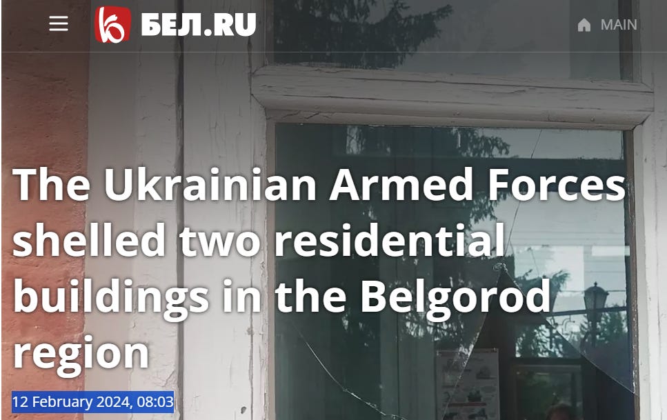 And Donetsk isn’t the only Russian city subjected to Ukrainian shelling—Belgorod is now being bombarded on a regular basis. I guess it makes sense that Putin wouldn’t want to bring this up, but if Tucker’s aim was to enlighten “uninformed Americans” about the goals and achievements of the SMO, maybe he should have asked Putin why after two years of war the Ukrainian military is still able to shell Russian territory with total impunity? Seems very topical to me.