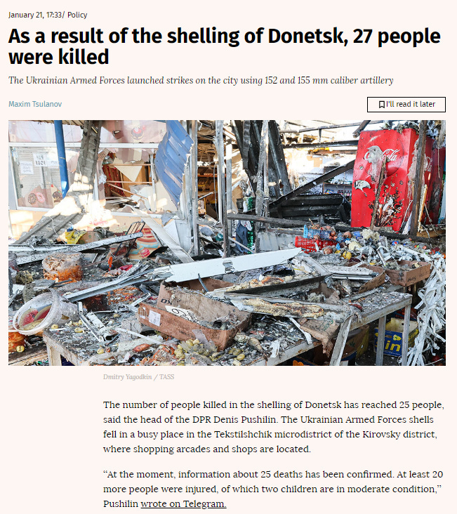 According to the United Nations, a total of 25 civilians were killed in Donbass in the year preceding the start of the SMO. At the end of January—almost two years after the start of Russia’s military intervention—27 people in Donetsk were killed in a single day by Ukrainian shelling.