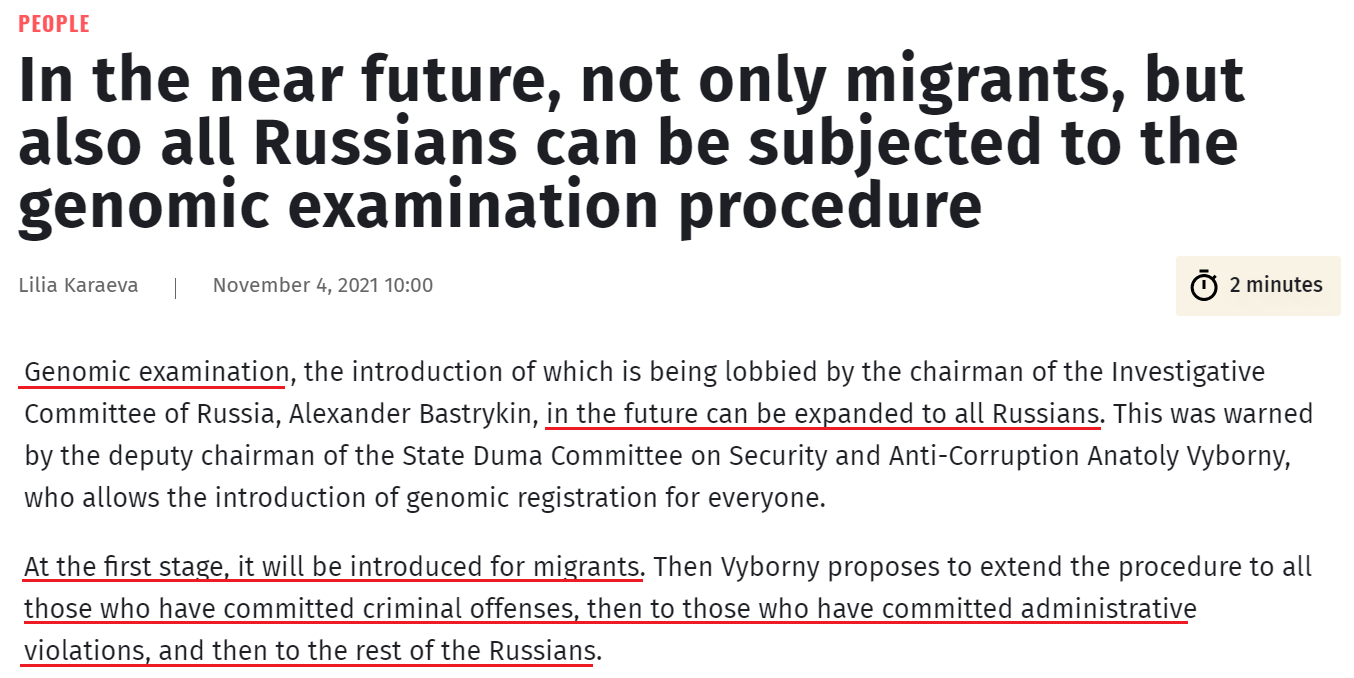 Meanwhile, Russia’s health ministry is reportedly gearing up to collect baby DNA to be used for “genetic certification of newborns.” Because Russians should be tagged early and often.