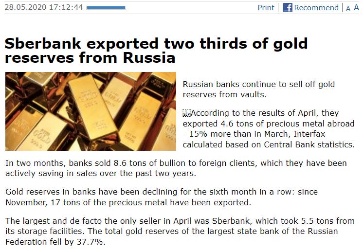 Sure enough, over a six-month period ending in May 2020, Sberbank exported two-thirds of its total gold reserves: