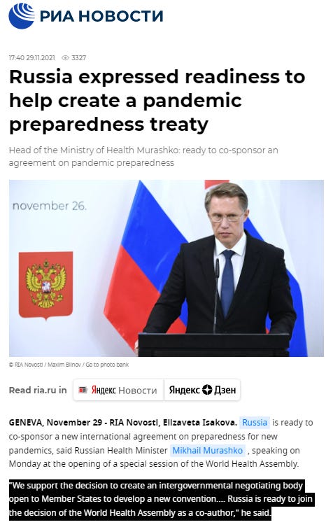There you have it: Medvedev has fully endorsed the idea of a pandemic treaty and wants Russia to submit to the WHO whenever there are too many positive PCR tests or other existential threats to public health. (It’s charming how over the last two months, Medvedev has endeavored to rebrand himself as a mighty crusader against the depraved West. Yes, he’s a true patriot.)