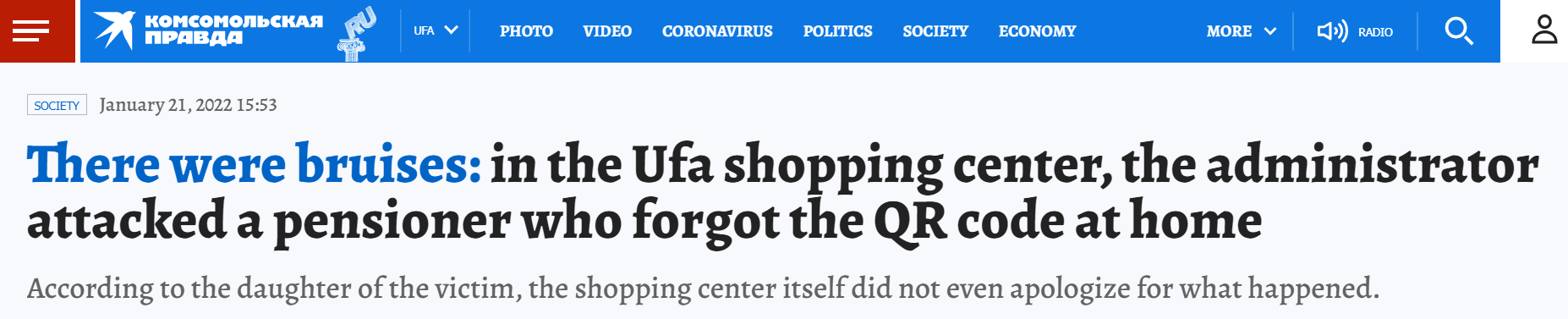 Ufa resident Elena Gareeva complained that her 62-year-old mother and aunt were beaten in a shopping center because the women did not have QR codes with them. At the same time, both Ufa women were vaccinated, just by an unfortunate accident they forgot the supporting documents at home.