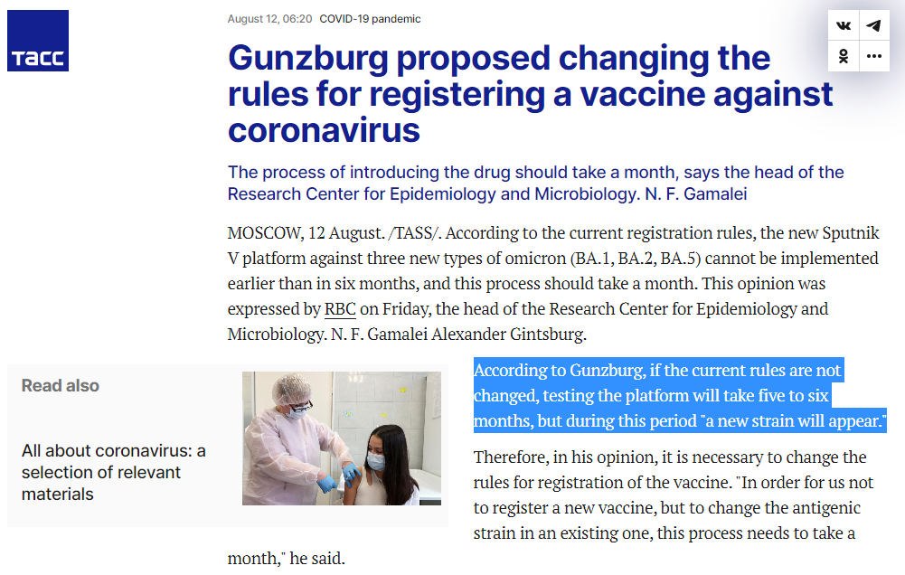 Modifications to Sputnik V will only require clinical trials involving “50 healthy volunteers.” However, the protocols for preclinical trials are not subject to a review process. Final approval for the modified “vaccine” (which typically takes at least six months) has been expedited to 16-38 days: